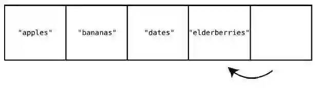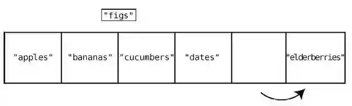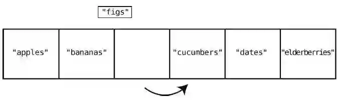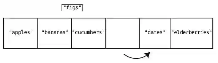 为了达到目的,我们必须先把"cucumbers"、"dates"和"elderberries"往右移,以便空出索引2。而这也不是一步就能移好,因为我们首先要将"elderberries"右移一格,以空出位置给"dates",然后再将"dates"右移,以空出位置给"cucumbers",下面来演示这个过程。