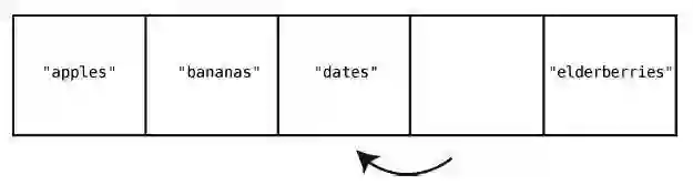 虽然删除"cucumbers"好像一步就搞定了,但这带来了新的问题:数组中间空出了一个格子。因为数组中间是不应该有空格的,所以,我们得把"dates"和"elderberries"往左移。