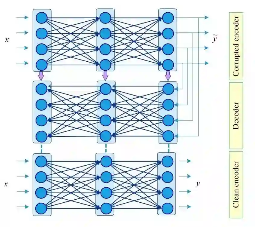 阶梯网络在无监督和半监督学习任务中达到了先进的水平。阶梯网络由两个编码器和一个解码器组成。编码器作为网络的有监督部分,解码器进行无监督学习。训练目标是最小化有监督部分和无监督网络的损失和。