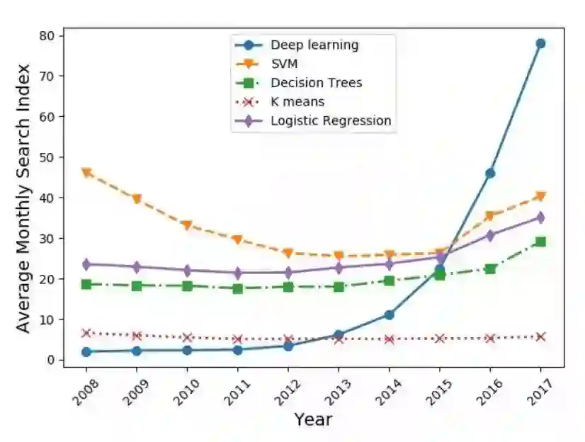 Google Trend显示近几年对深度学习的关注呈上升趋势