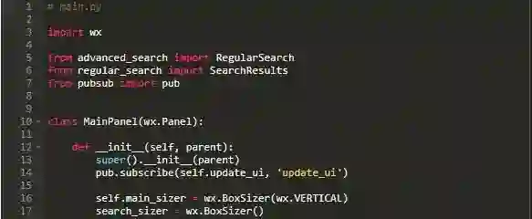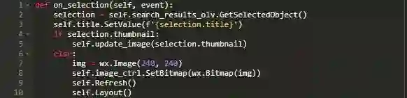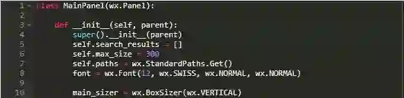 MainPanel是程序的主体。这里,您可以处理一些内务工作并创建一个search_results,以便用户搜索时保存Result对象列表。您还可以设置缩略图的max_size,要使用的字体,sizer以及标准路径等。