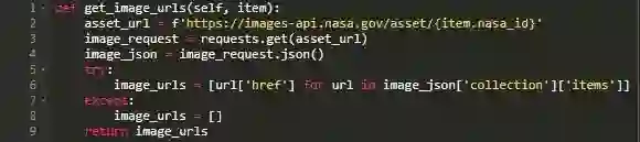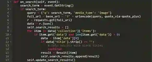 这里,on_search()事件将获取用户输入的字符串或者返回一个空字符串。假设用户实际输入了要搜索的内容,则使用NASA的常规搜索查询,q并对media_type进行硬编码以实现成像。之后,将查询编码为格式正确的URL,并通过requests.get()来请求JSON响应。