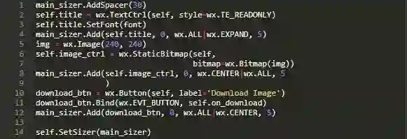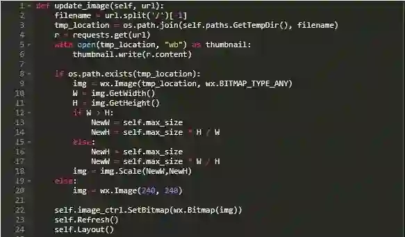 这里,update_image()接收URL作为其唯一的参数。它接收此URL并拆分文件名。然后通过计算机的临时目录创建一个新的下载位置。接着下载图像并检查文件是否存储正确。如果是,则使用设置的max_size加载缩略图;否则将设置为空白图像。