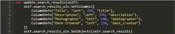 这段代码设置ObjectListView的方式和我的其他一些文章中的方式非常相似。您可以通过调用SetEmptyListMsg()来自定义空消息,还可以将窗口部件绑定到EVT_LIST_ITEM_SELECTED,以便用户在选择搜索结果时执行某些操作。