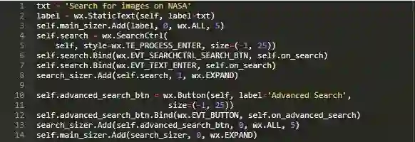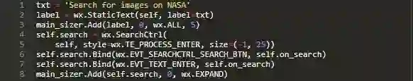 这里,使用wx.StaticText为应用程序创建标题标签。然后,添加了wx.SearchCtrl,其与wx.TextCtrl非常类似,只不过内置了特殊的按钮。此外还将搜索按钮的单击事件(EVT_SEARCHCTRL_SEARCH_BTN)和EVT_TEXT_ENTER绑定到搜索相关的事件处理程序(on_search)。