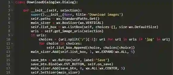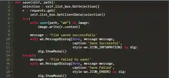 在此示例中,您将创建StandardPaths的新引用并添加wx.ListBox。列表框将包含可下载图像的变量。如果结果太多无法同时显示,它还会自动添加滚动条。通过传入selection对象调用get_image_urls以获取URL列表,然后遍历urls并提取名称中包含jpg的urls。这将导致遗漏其他图像文件类型,例如PNG或TIFF。