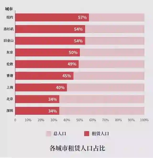 根据哈佛大学住房研究中心数据显示,纽约、洛杉矶、旧金山等核心都市的租赁人口占比均在 50%左右,而房价同样很高的北京租赁人口占比只有 34%。