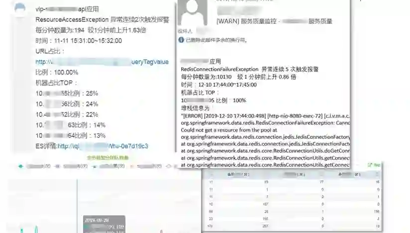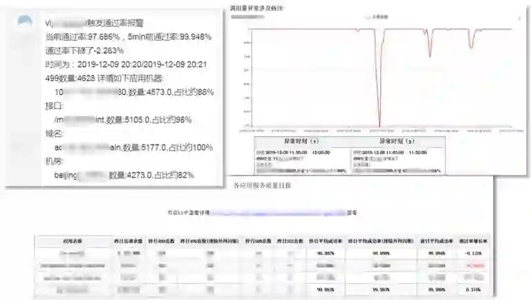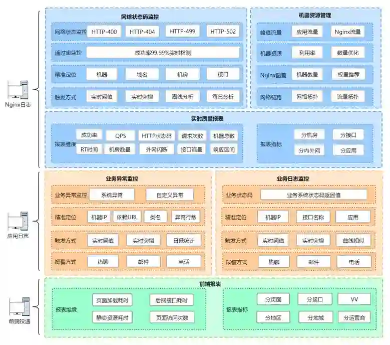 利用Nginx日志、应用异常日志、应用访问、前端投递日志进行如上不同维度的分析,实现了固定阈值、实时突增等触发方式,热聊、邮件、电话等推送方式。