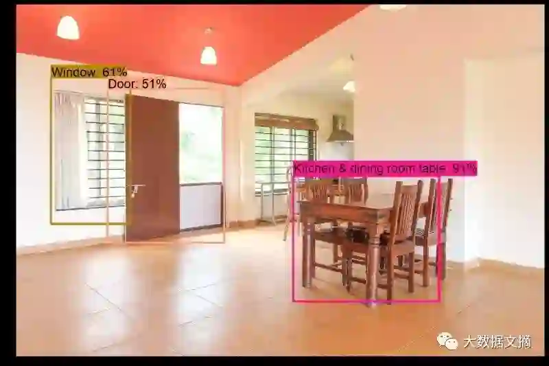 在下面的例子中你会看到,该模型能够检测到门、窗、餐桌及其位置。 通过使用Tensorflow Object Detection API,我们对房主上传的照片做了一些快速评估。使用现成的结果已经可以检测到很多家居设施。