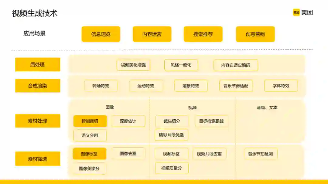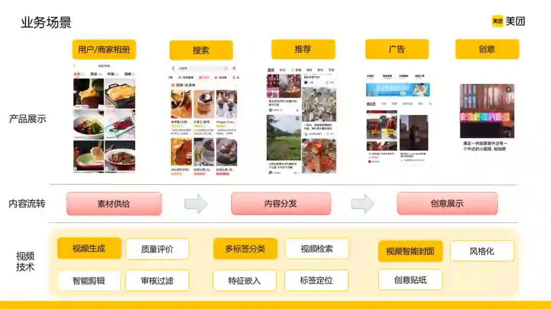 按照视频行业的大致划分,美团的视频绝大多数属于本地生活场景的碎片消费,这其实也是符合大家的认知的。美团的业务场景非常多,不管是在B端还是C端,丰富的供给源和展位都有非常多短视频内容的呈现。在这样的背景下,可以看到美团不仅有丰富的应用场景,同时又有丰富的视频内容和展位。对应到线上的这些应用,往下技术层要做的事情也就逐渐浮出水面,它是一个从视频内容的素材供给到内容分发以及创意展示全链条的一个AI赋能的情况,同时也可以看到在每一个内容流转的环节都有很多计算机视觉技术可以去发挥作用。