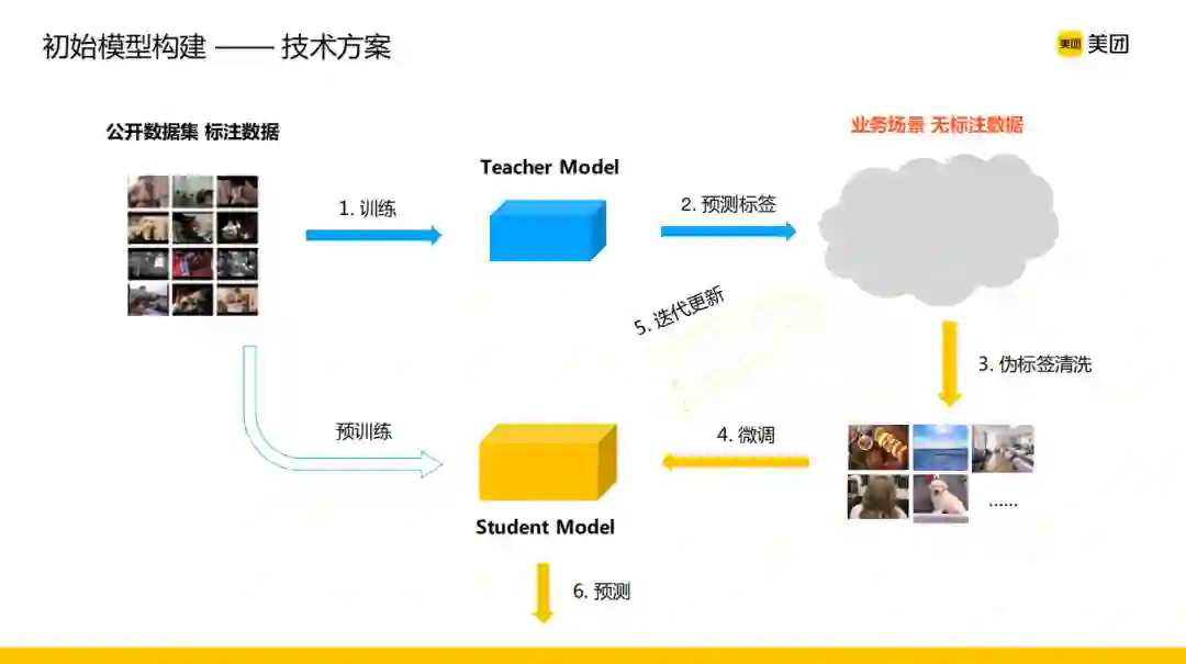 由于YouTube-8M数据集的内容和本地生活场景还是有比较大的差别,数据内容和标签的差异是接下来我们要处理的一个更为困难和实际的问题,这也是当前任何一套数据驱动的Deep learning model需要克服的问题。在Facebook以及Google的一些工作的启发下,我们提出了一套半监督的、知识迁移的学习范式,首先利用公开数据集训练的Teacher Model在业务场景下的无标注数据上进行打标,在这个过程中利用置信度卡控、相似性距离度量或者Label Propagation这类半监督学习常用的方法进行一些伪标签的清洗,从而获得业务场景下的一些标注数据,然后利用这些标注数据进行Student model的微调。这个过程可以进行若干轮的迭代,Student model学习到一些信息之后,可以又变成Teacher model进行下一轮的迭代。通过这样一番初始模型的构建,我们在业务场景的数据下,看到一个明显的效果提升,不同的品类下的一些视频标签的准确率有了非常大的提升。