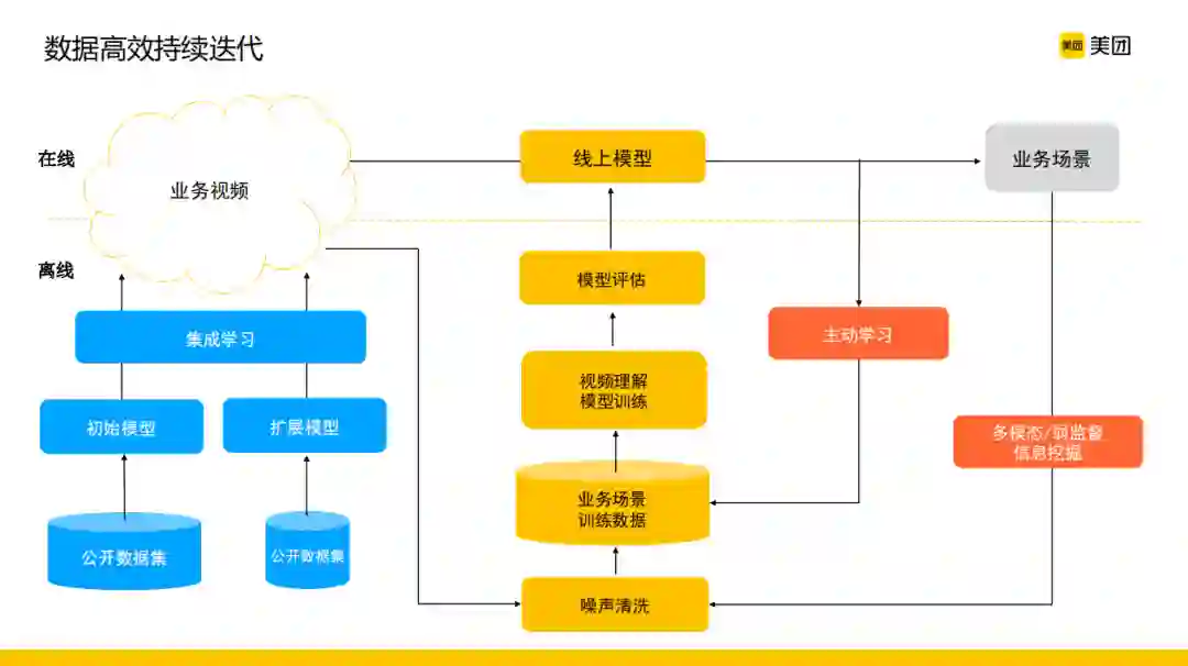 第三步面临的问题是如何实现数据高效持续的迭代,因为考虑到标签体系的扩展过程以及样本随时间的迁移,要求我们有一个持续学习的过程。图中蓝色部分基本代表了模型的冷启动与标签维度扩展,更重要的是要有一套从线上回流的机制,对应红色部分。一方面在没有业务场景标签交互的情况下,通过主动学习的方式查询一些最值得人工标注的样本,例如基于置信度或者多模型投票都可以很有效的找出模型理解不到位的线上真实样本,然后通过人工标注的方式扩充样本。另一方面业务场景中有很多弱监督的数据,利用这部分数据能够很好的帮助我们持续去迭代模型的性能。