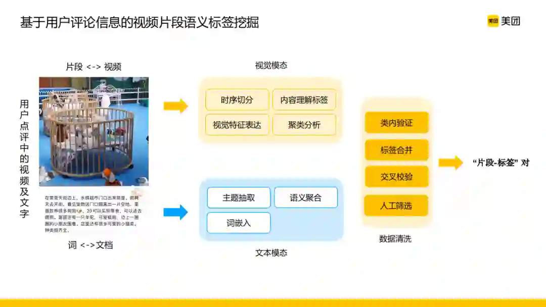 在美团的场景下,我们可以看到用户在拍摄一段点评视频的同时,还会配有相应的一段描述文字,这个时候两个模态之间是有很多相关性或者说共识存在的,而且视觉维度一个视频片段和整段视频的关系与文本维度一个词与整段文本之间的关系是有可类比性的。在这种情况下,我们分别对视觉模态和文本模态进行一些处理,然后将两方面相关的理解结果进行标签合并、交叉校验等数据清洗操作,进而挖掘出一大批“片段-标签”对。