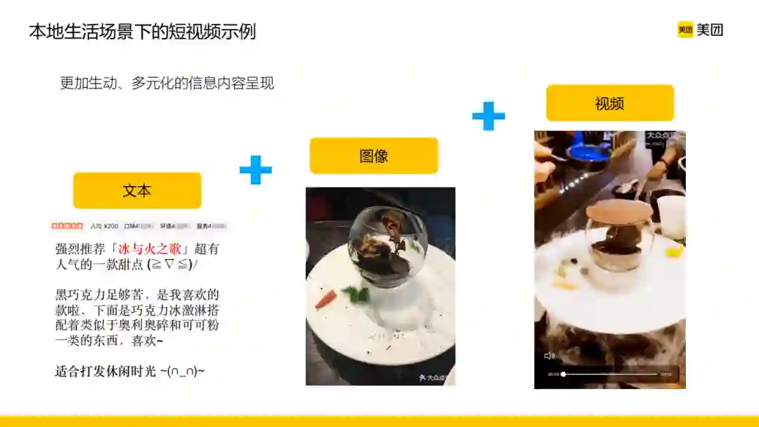 在美团的业务场景下,为什么要对视频数据进行利用和分析?以常见的用户点评为例,传统的文本加图像在呈现信息的时候会有一些不足,相比之下,如果以视频点评的形式去呈现一个非常有创意的内容,不仅对商家来说是一个比较好的信息的宣传,对于用户来说,也是一个更加生动的信息获取的维度。在这种情况下,相信大家可以感受到美团在短视频上其实是大有可为的。