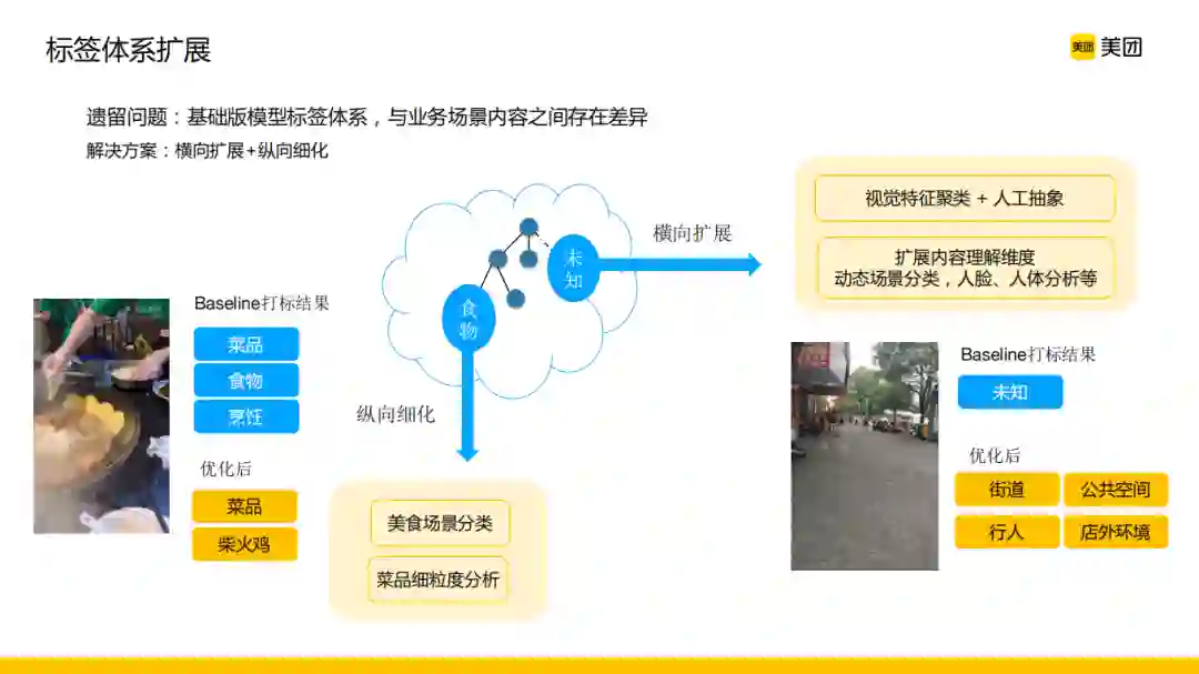 第二步紧接着面临的问题是初始的标签体系难以保证对业务场景内容有一个很好的覆盖,这里我们从横向扩展与纵向细化两方面进行了标签体系的扩展。