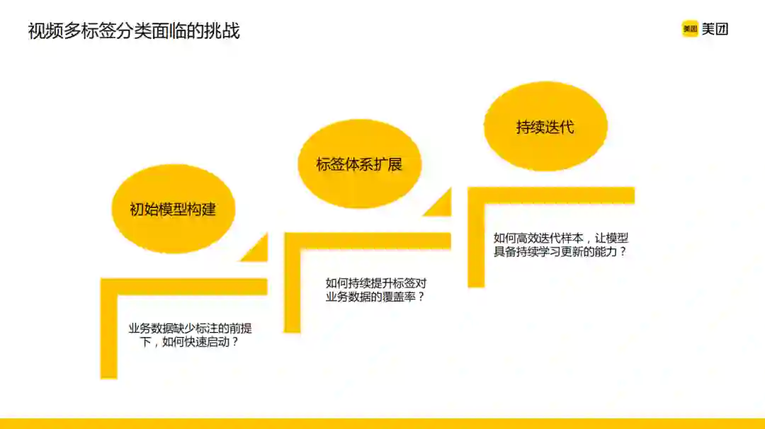 视频多标签分类有什么难点呢?在美团的场景下,数据非常丰富多样,如何有效构建模型以及我们的标签体系成为分类模型启动阶段需要克服的第一个困难。其次,初始模型构建之后,前期要对标签保证一个准确率,但是标签覆盖率可能会有一定问题,很多业务数据是打不上标签的,如何进行标签体系的扩展是第二步。最后,因为内容的更新和迭代是一个持续的过程,所以技术打标的能力也是需要有一套能够增量学习的机制,从而进行高效的样本迭代,这是第三个非常关键问题。下面分别就这三步介绍我们在这方面的一些技术实践。