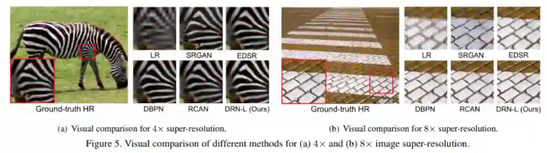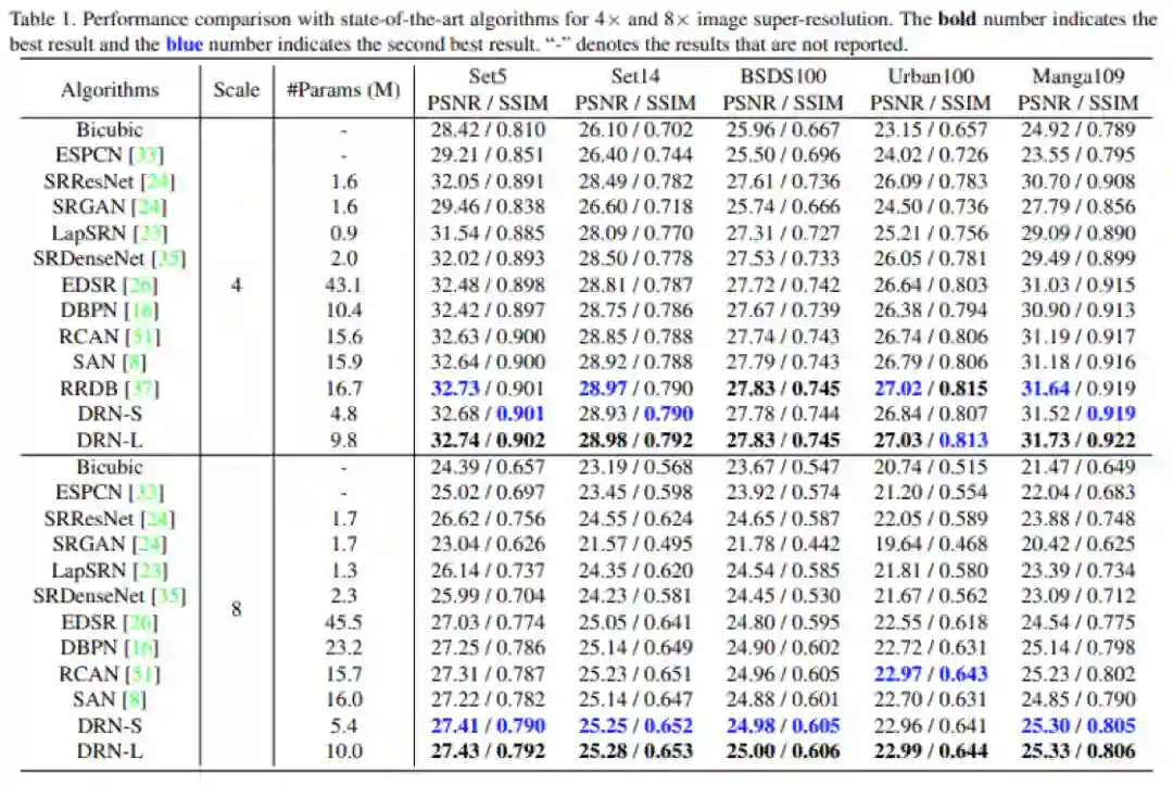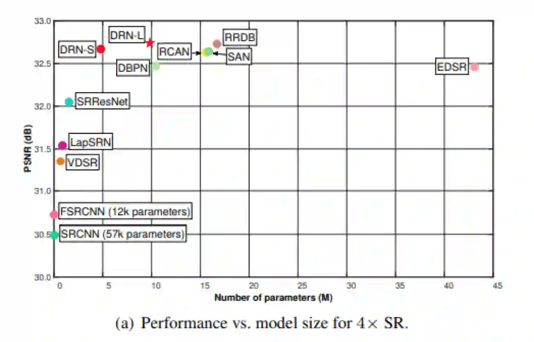 作者首先展示了4x和8x SR的性能和模型大小的比较。在实验中,作者提出了两种模型,即小模型DRN-S和大模型DRN-L。而对比的方法是从它们的预训练模型,开源的代码或是原始论文中获得的结果。结果如下: