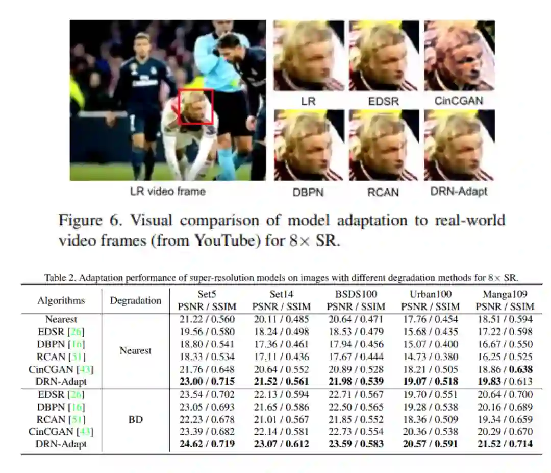 更关键的是,由于对偶回归过程不依赖于HR图像,因此我们可以直接从LR图像中学习。从这个意义上讲,我们可以轻松地将SR模型适应于真实场景的数据,例如来自YouTube的原始视频。实验结果证明了本文方法是优于现有方法,且能在真实场景上取得较好的结果。