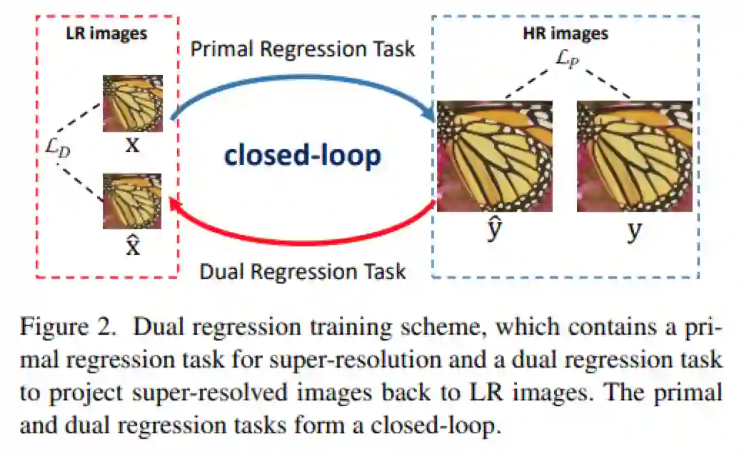 本文通过引入其他约束条件提出了对偶回归方法,以便形成闭环的映射,可以增强SR模型的性能。此外,本文还从理论上分析了该方案的泛化能力,从而进一步证实了该方案是优于现有的方法。