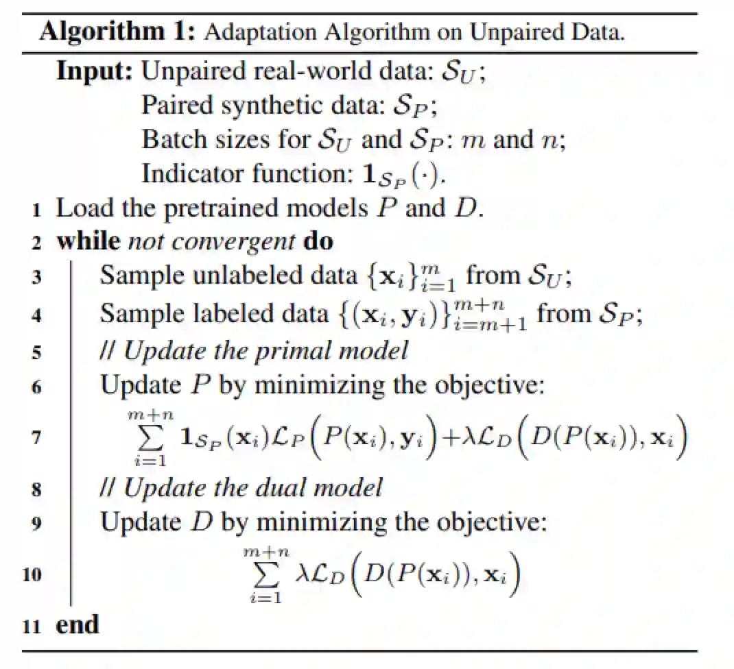 这是一种半监督的学习方法,使用配对的数据训练P网络,使用没有配对的数据训练D网络。目标函数如下,其中当使用有标签的数据时,1Sp为1,当使用没有标签的数据时,1Sp为0。