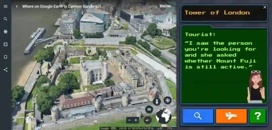 现在,谷歌地球推出了神偷卡门的联动页面。这里还原了PC游戏的风格和玩法,可以游览世界各地的地标建筑,并与路人对话,了解神秘的艺术品大盗卡门•山迪亚格接下来会出现在哪里。