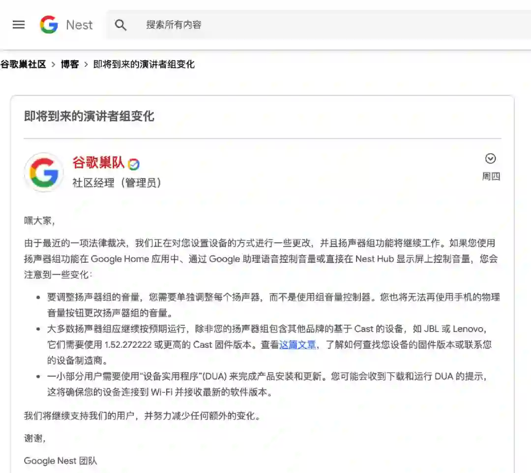 Google Nest 团队的官方账号近日也在社区里发出公告,表示由于最近的一项法律裁决,Nest 音响组无法再使用组音量控制器去调节音量,而是需要单独调整每个扬声器,而且无法再使用手机的物理音量按钮更改扬声器组的音量。极大地削弱了 Nest 的互联体验。
