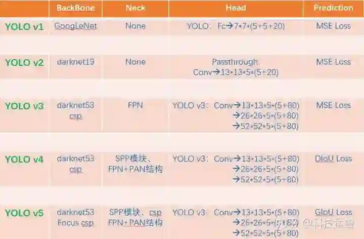 目标检测器模型的结构如下图1所示,之前看过了YOLO v2 v3 v4 v5对于检测头和loss函数的改进,如下图2所示,下面着重介绍backbone的改进: