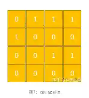 答:看葫芦娃的大娃,他的脸跨了4个区域(grid),但只能某一个grid的c=1,其他的c=0。那么该让哪一个grid的c=1呢?就看他的脸的中心落在了哪个grid里面。根据这一原则,c的真值为下图7所示: