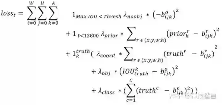 loss = 0for img in img_all:for i in range(3):for j in range(4):c_loss = lamda_1*(c_pred-c_label)**2geo_loss = c_label*(x_pred-x_label)**2 +\c_label*(y_pred-y_label)**2 + c_label*(w_pred-w_label)**2 + \c_label*(h_pred-h_label)**2class_loss = 1/m * mse_loss(p_pred, p_label)loss_ij =c_loss + geo_loss + class_lossloss += loss_ijloss.backward()