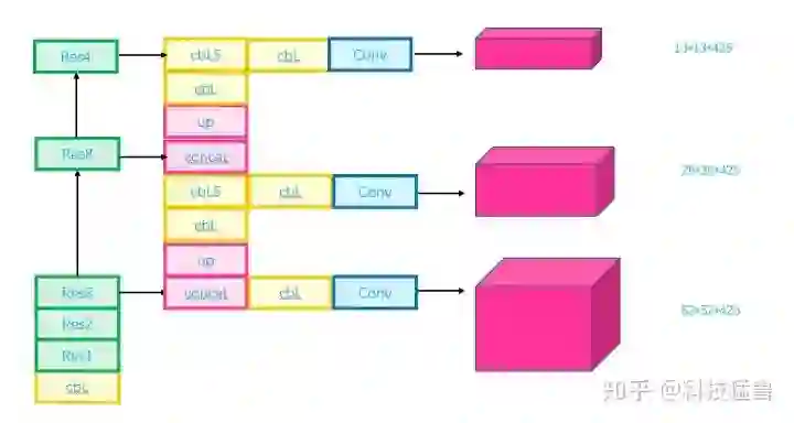 特征融合的方式更加直接,没有YOLO v2的passthrough操作,直接上采样之后concat在一起。