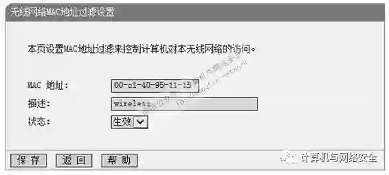 (5)在该界面添加允许访问其AP的客户端Mac地址,并添加描述信息。本例中添加的条目,如图18所示。然后单击“保存”按钮,将显示如图19所示的界面。
