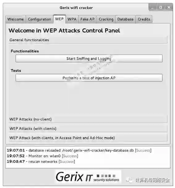 (10)该界面显示了WEP的攻击方法。在该界面的Functionalities选项下,单击Start Sniffing and logging按钮,将显示如图13所示的界面。