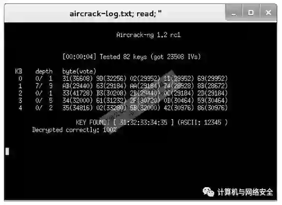 (14)从该界面可以看到,破解WEP加密密码所用时间为3分28秒。当抓取的数据包为20105时,找到了密码,其密码为abcde。如果在该界面没有破解出密码的话,将会继续捕获数据包,直到破解出密码。