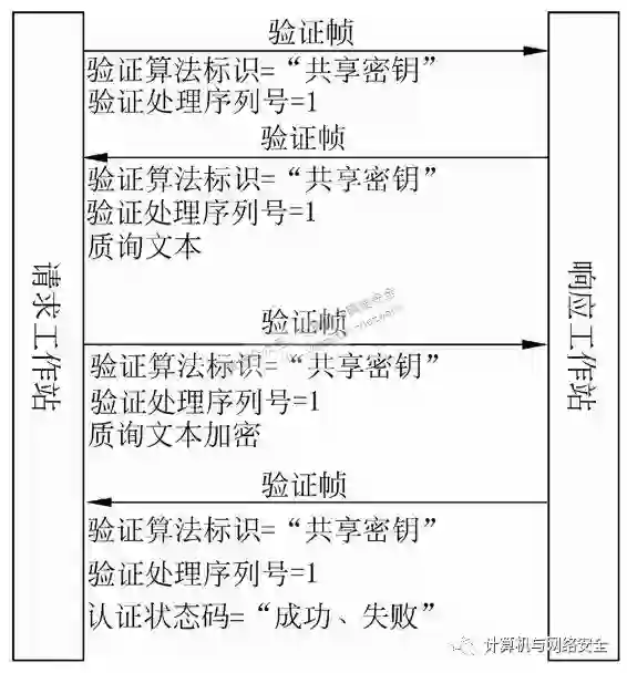 1)请求工作站发送认证管理帧。其帧体包括工作站声明标识=工作站的Mac地址、认证算法标识=共享密钥认证、认证事务序列号=1。