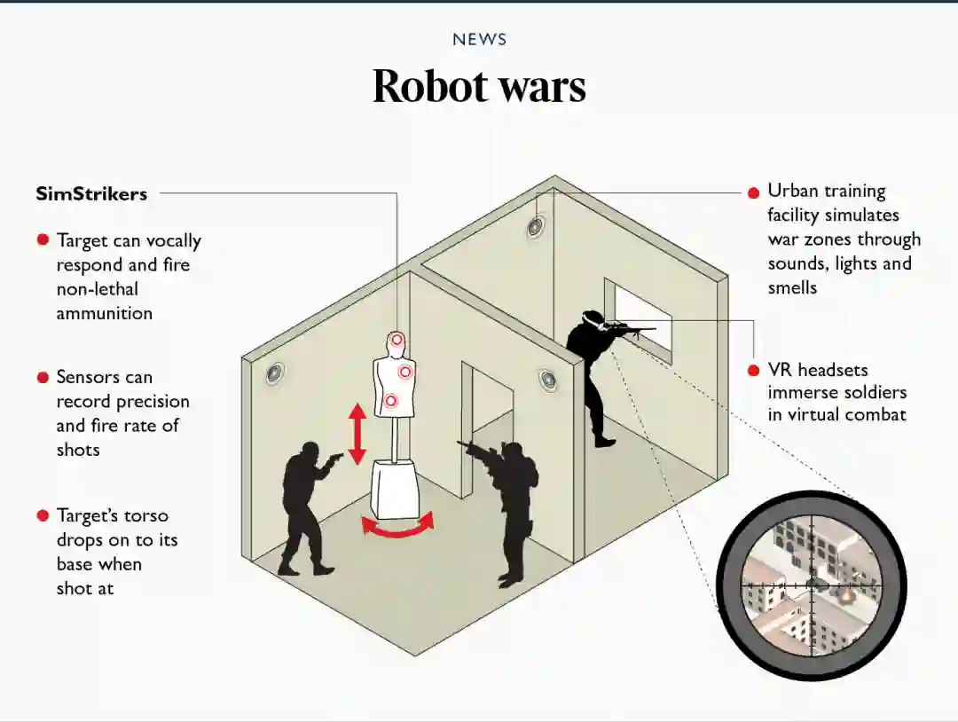 这些机器人士兵也不是吃素的。他们都装备有BB枪式弹丸,可以向部队开火,还能在精英部队进入建筑物时旋转着面对他们。这些BB枪式弹丸会从人形机器人的头部和臀部发射,人体模型上的传感器还可以记录受训者在训练场景中的射速和准确性。