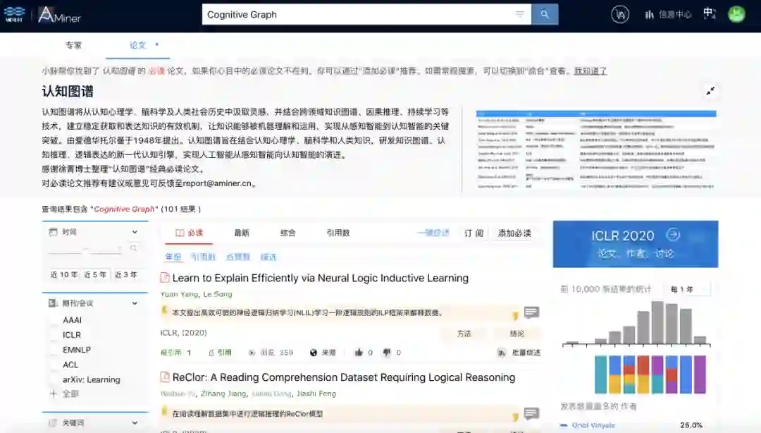 用户只需在检索框输入 “Cognitive Graph” 或中文 “认知图谱”,就能看到认知图谱的简要概述和该领域的精选必读论文。每一篇必读论文由程序自动计算出了一句话内容概括作为 “推荐理由”;必读论文列表支持按照发表年份、引用数、点赞数等进行排序。