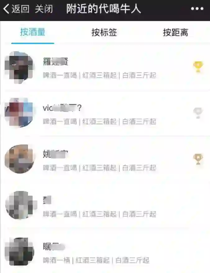 定位完成后,用户可按照“按酒量”、“按距离”、“按标签”等标签,针对性寻找代喝者。每个代喝者信息除了头像、昵称外,分别是对啤酒、白酒和红酒的酒量标注。“酒量健儿,冠军级酒场选手”、“酒场潜力股,分分钟创造酒量奇迹”……一个个贴有自己属性标签的“代喝牛人”就在定位附近,有需求就可以通过“给TA留言”与其取得联系。