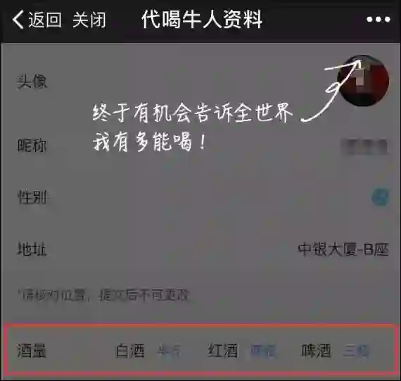 该平台还有一个“我也能喝”选项,填写昵称、地址、性别和酒量等信息后,就可以完成资料注册,摇身一变成“代喝牛人”。