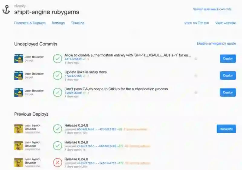 ShipIt 是我们的部署工具,是 Shopify 持续交付的核心。ShipIt 是一个编配器,负责运行和跟踪项目的部署脚本。它支持直接部署到 Rubygems、Pip、Heroku 和 Capistrano。对我们来说,主要是 kubernetes-deploy 或 Capistrano(用于遗留项目)。