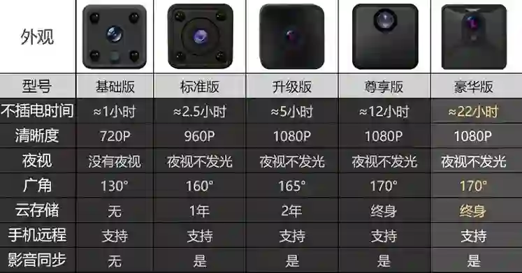 从基础版到豪华版各种种类,价格也不同。最便宜的基础版不插电可以使用1个小时,清晰度720P,没有夜视功能,130°广角,可以手机远程但是不支持云储存和影音同步。