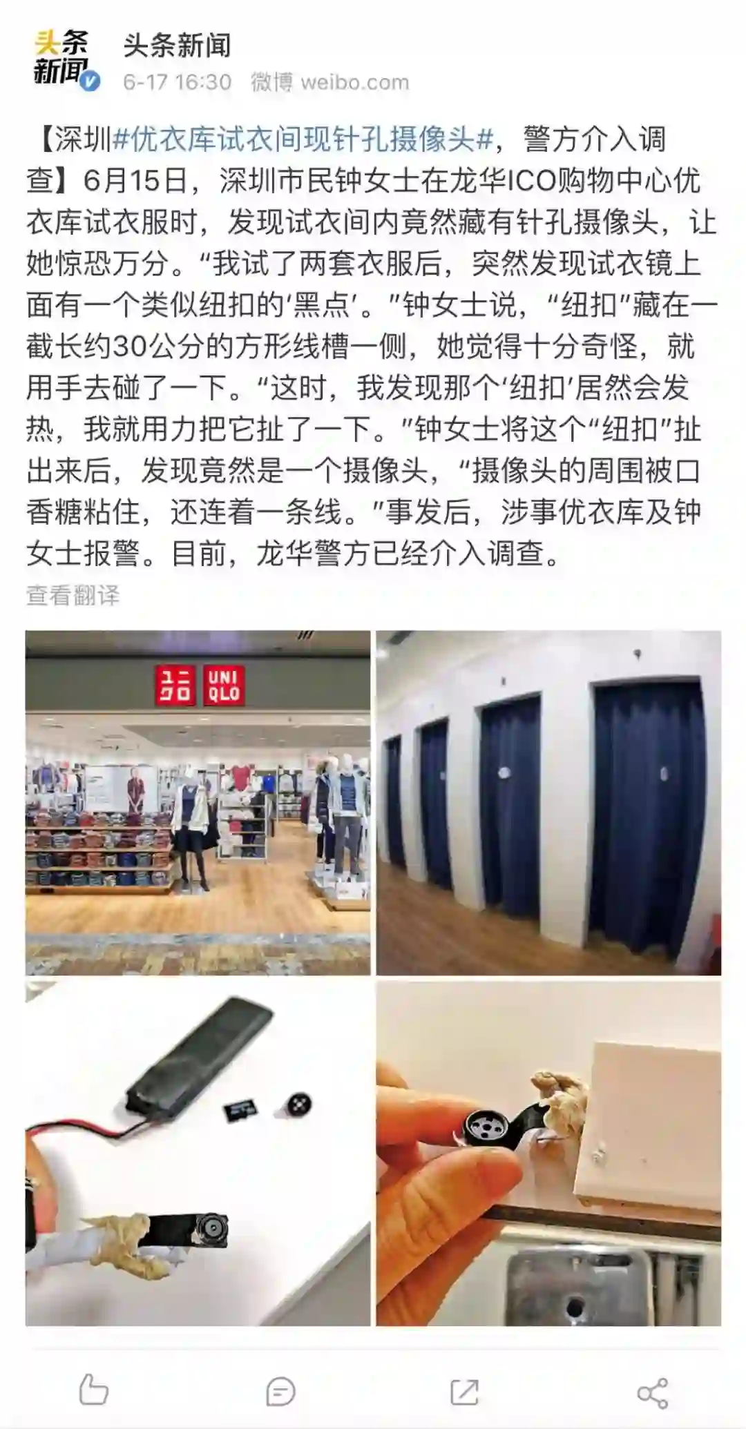 报道中提到,6月15日下午钟女士在优衣库试衣服期间,无意间发现了针孔摄像头(发现试衣镜上面有一个类似纽扣的‘黑点’),随后在店长的帮助下,双方一起选择了报警。