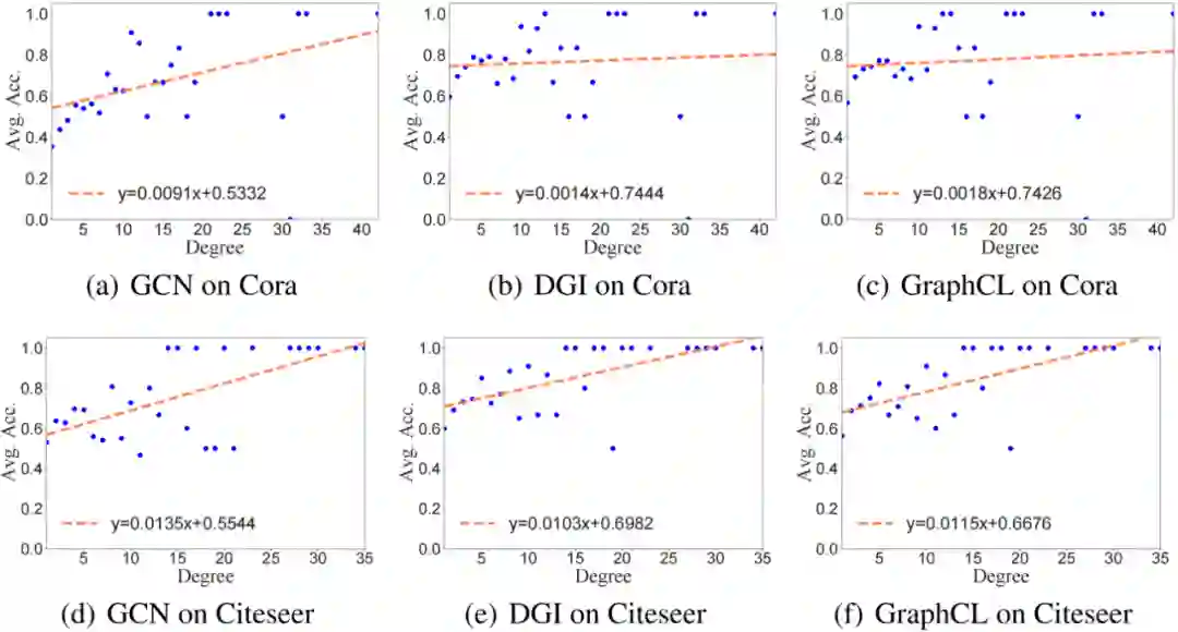 我们通过实验探究,惊奇地发现 GCL 方法中度大和度小节点间的性能差距小于 GCN,展现出缓解结构不公平性的潜力。此时,一个关键的问题自然出现: