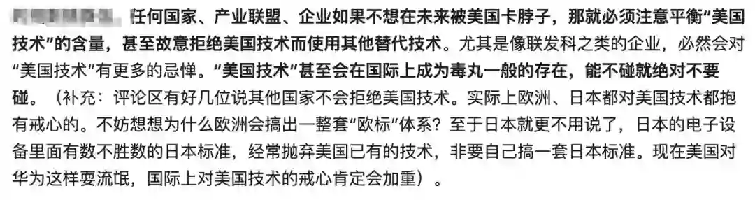 「任何国家、产业联盟、企业如果不想在未来被美国卡脖子,那就必须注意平衡『美国技术』的含量」