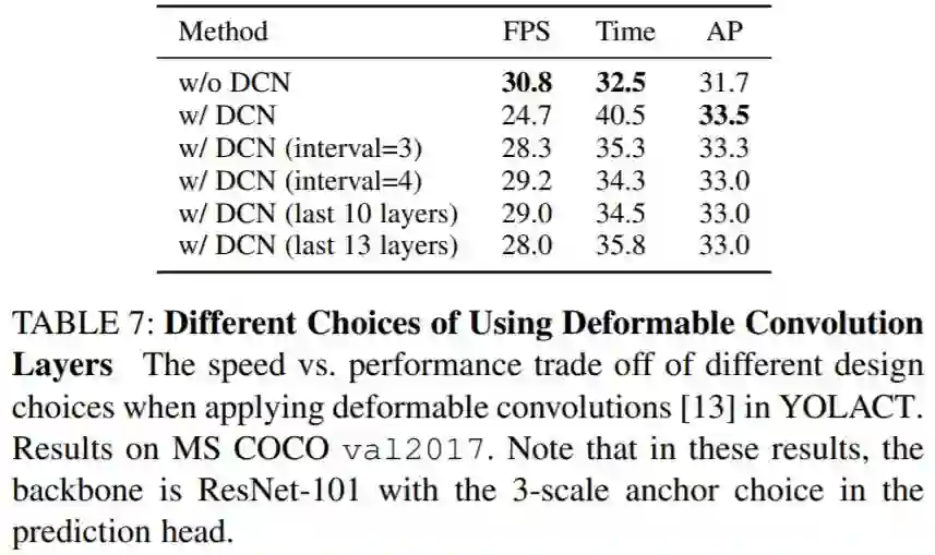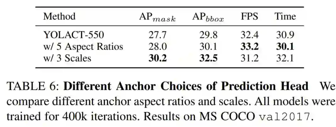 作者尝试两种变体:(1)保持尺度不变,同时将anchor长宽比从[1,1 / 2,2]增加到[1,1 / 2,2,1 / 3、3],以及(2)保持 长宽比不变,同时将每个FPN level 的比例增加三倍([1x,2^(1/3)x,2^(2/3) x])。与YOLACT的原始配置相比,前者和后者分别增加了5/3倍和3倍的 anchors 数量