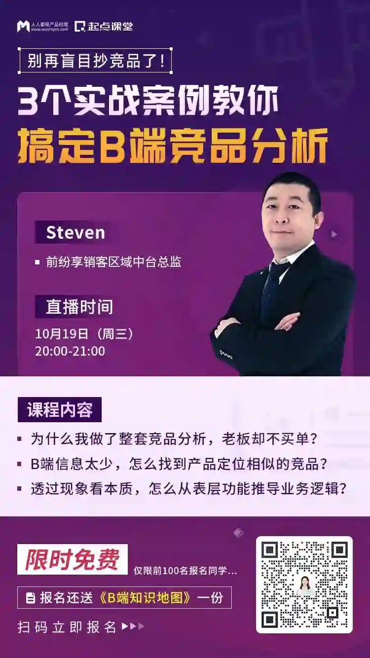 10月19日(周三)晚8点,人人都是产品经理&起点课堂特邀深耕B端行业18年、前纷享销客区域中台总监@Steven老师在线分享。