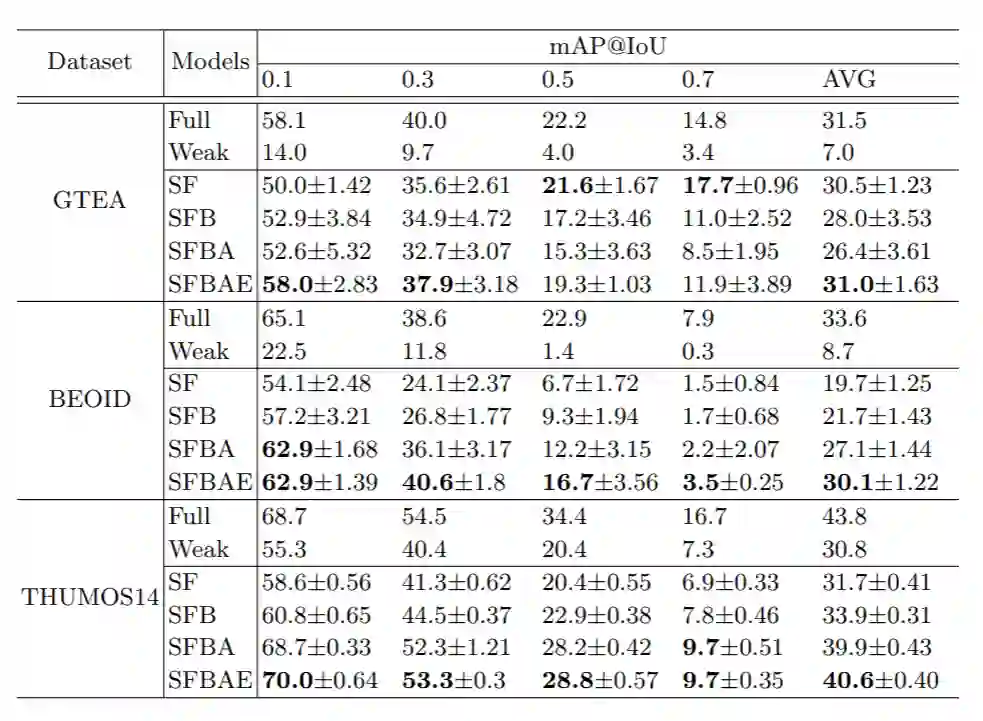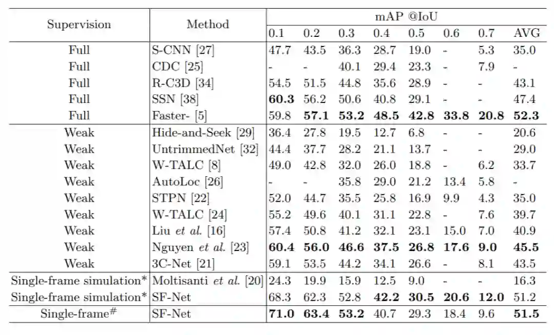 上面是Fully, Wekaly, 和single-frame 使用同一模型的比较结果。可以看到再GTEA 和 BEOID这两个数据集上,weakly的方法失效了,检测结果比较差。在使用single-frame的标注数据后,我们的模型与基于fully-supervised的模型相比,对于目标动作的检测性能几乎差不多(lower IoU)。但对于动作的精细发生区间检测(higher IoU),模型的性能表现一般。这主要是由于精细视频动作边界还是需要更多的监督信息来指导模型训练