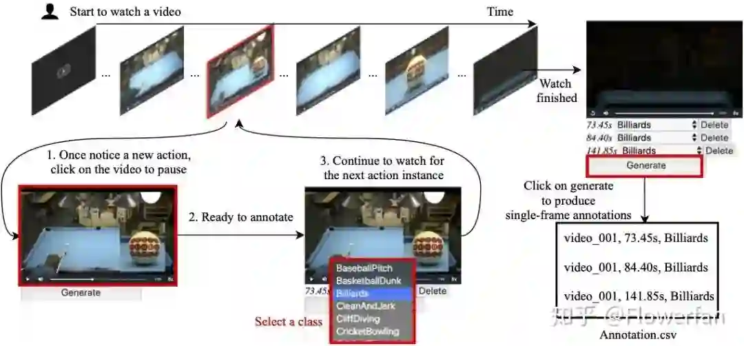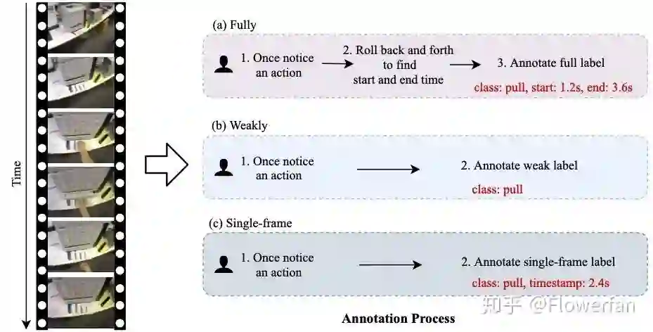 Fully 标注一般需要给出每个动作的起止结束时间,这个在人工标记的时候比较麻烦。在标记视频动作边界的时候,标注者可能需要反复观看视频。而这个过程及其耗时,对于某些段时间内发生的动作,可能还需要放慢倍数对动作的时间边界进行准确的标注。一个10分钟的视频中有10个目标动作,人工标记的时间很可能远远超过10min,有时候还需要多个标注者标注同一个视频来校准边界标注。