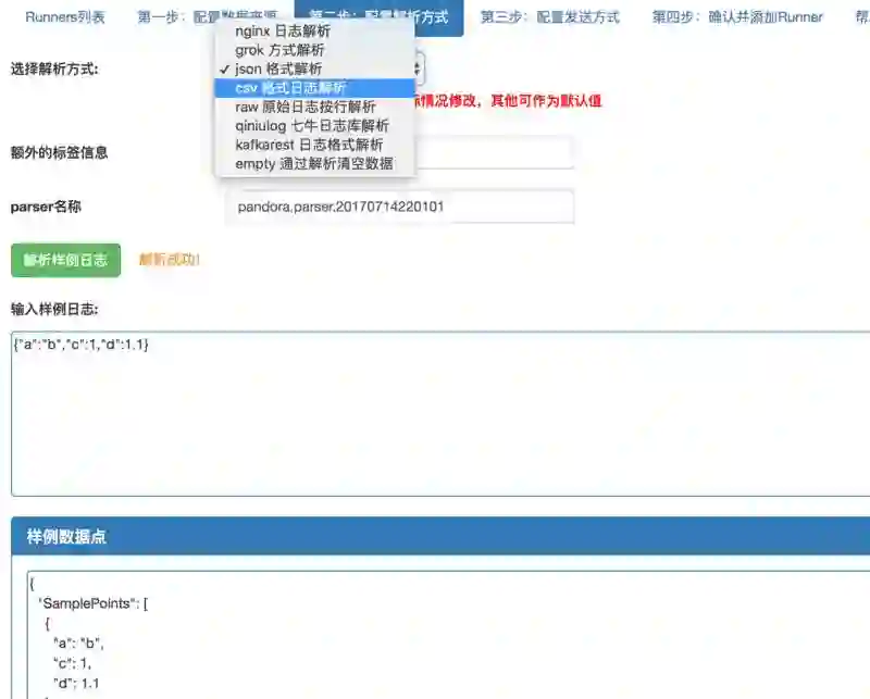 根据需要一步步选择数据源、配置解析方式、发送方式最后确认并添加。当然,在配置解析方式的页面,你还可以通过页面预先尝试解析器配置是否正确,如图 16 所示。