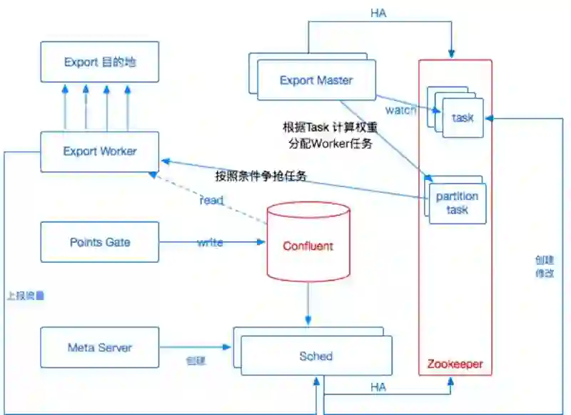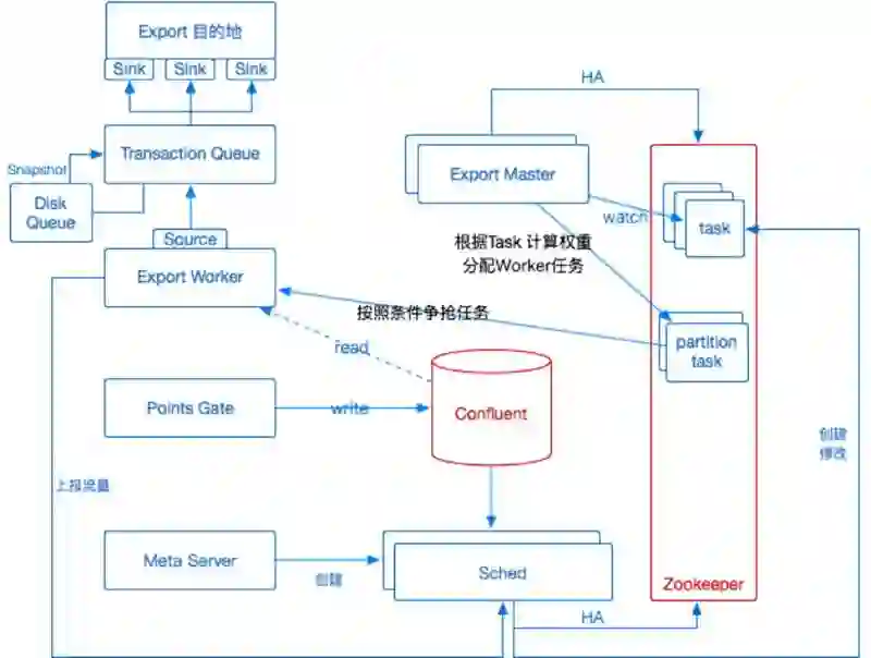 除此之外还有分布式系统的常见问题,需要保证 服务高可用,以及 水平扩展 的能力。保证任务单元标准化,任务粒度可以切分扩展;保证调度任务节点故障不影响其他节点的正常导出等等。