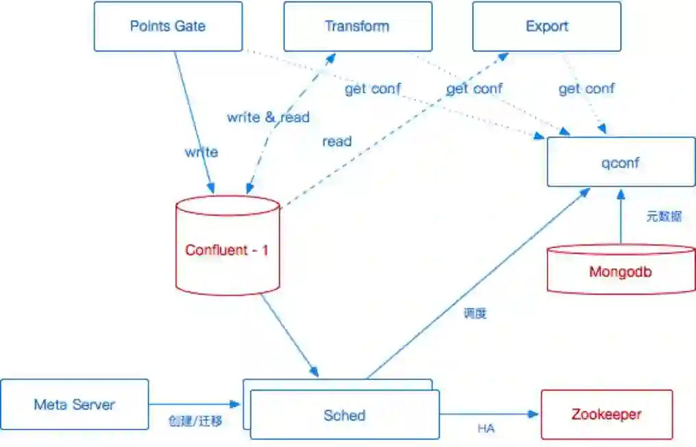 在进行元数据创建时,调度器在元数据服务器上创建一个用户元数据存储在 MongoDB 当中。对于 MongoDB 的元数据访问,我们构建了一个二级缓存系统(即图中 qconf),数据在进入或者导出时都会通过二级缓存访问元数据,这样数据就可以快速得到校验,扛住海量的数据吞吐。Kafka 本身包含了 Zookeeper 组件,我们也借此来保证整体系统组件的服务发现以及数据一致性这两个问题。